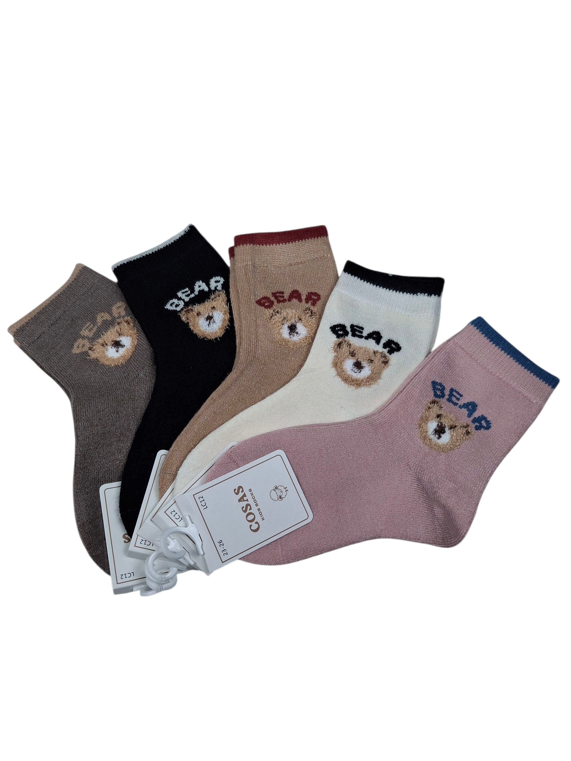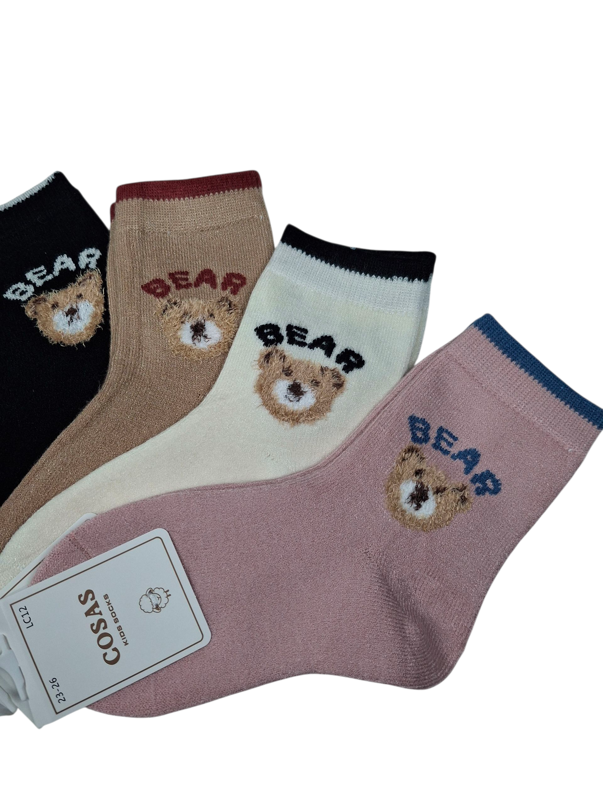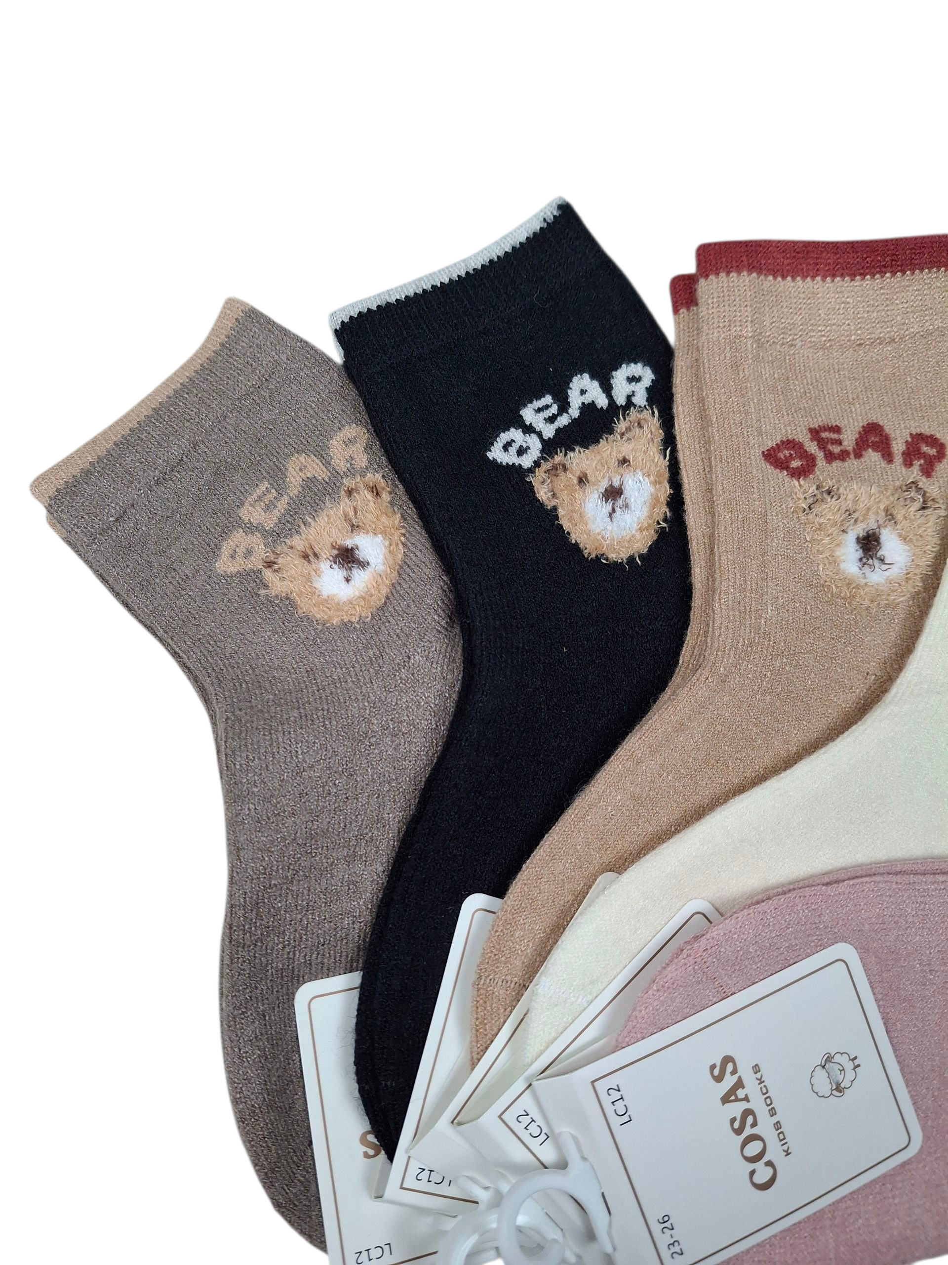 Ciepłe, miękkie skarpetki z motywem misia 🧸 Idealne dla dziewczynki – zestaw 4-pak z domieszką wełny, kolory wysyłane losowo.