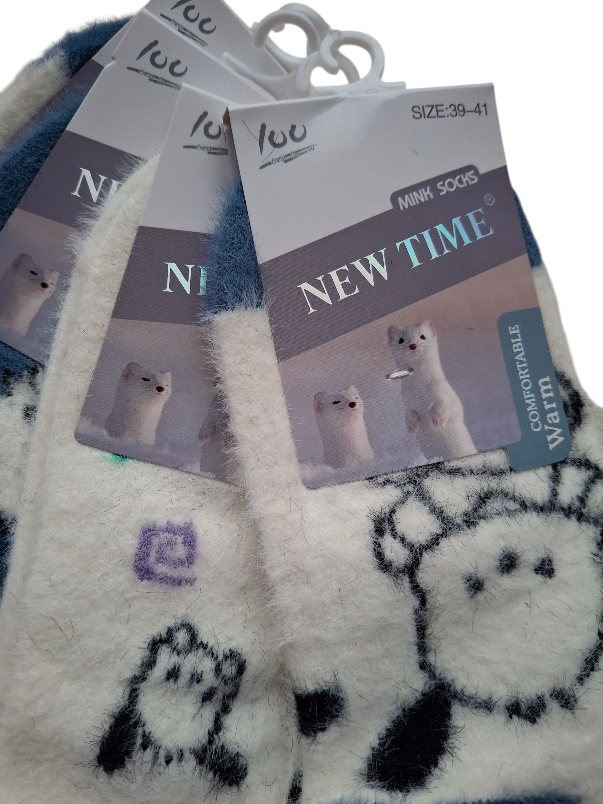 4-pak ciepłych, miękkich skarpetek damskich z włosem norek — niebiesko-białe, bardzo przytulne. Dostępne rozmiary 35–38 i 39–41. Kolory wysyłane losowo.