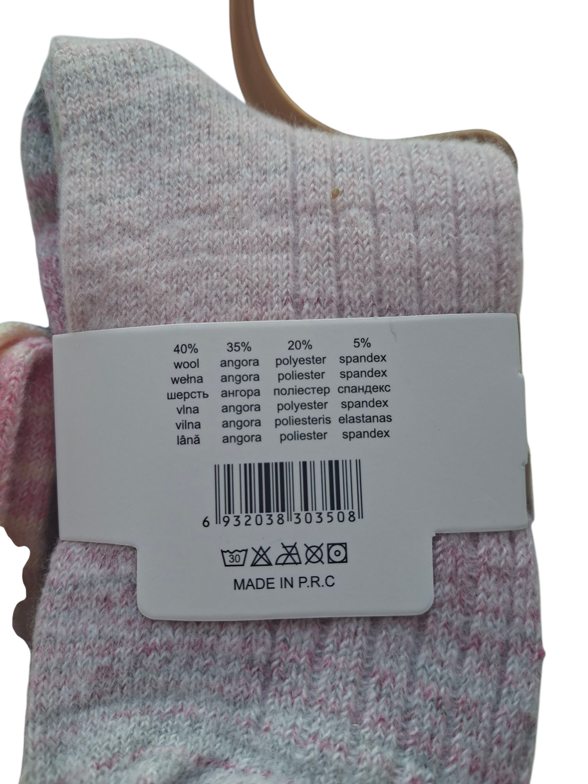 Zestaw 4 par kolorowych tęczowych skarpetek damskich – 40% wełna, 35% angora, 20% poliester, 5% spandex. Miękkie, ciepłe i stylowe – idealne na chłodne dni.